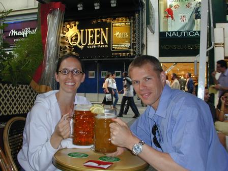 Large beer mugs & us in front of the Le Queen (Champs Elysees)