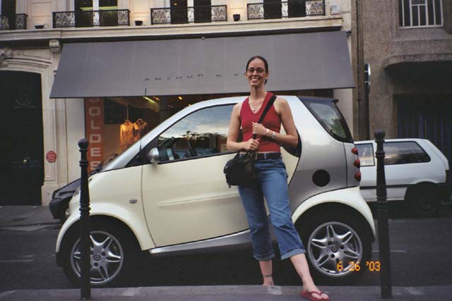 Kacy in front of a SMART CAR - don't crash in this car!!