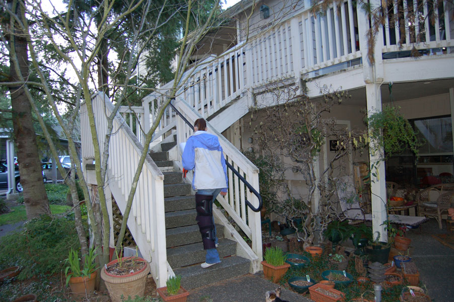 Kacy hobbling up the stairs